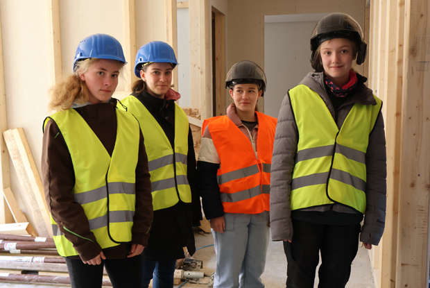 Auf der Baustelle waren auch die vier „Girls“, die den Aktionstag bei Holzvogel GmbH im unterfränkischen Theres zubrachten – doch das war erst die dritte Station, die die Teenager an dem Tag zu absolvieren hatten. Zuvor gab es Einblicke in die Tätigkeiten der Abteilung für Bauzeichnung und Planung.  Das vermeintliche Highlight fand jedoch gleich zu Beginn statt: Nach einem Rundgang über das gesamte Gelände konnten die 12- bis 14-Jährigen in der Produktion selbst aktiv werden und ein eigenes Vogelhäuschen bauen. Bei allen Tätigkeiten stand eines immer an erster Stelle: der Spaß.