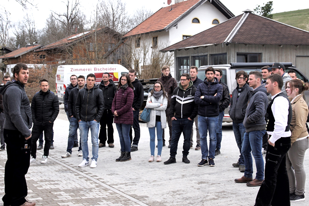 Holzbaujunioren: Das sind die angehenden Inhaber von Holzbaubetrieben. Am 27. März 2019 haben sie die Innungsbetriebe Holzbau Vorholz Hawran GmbH und die Jakob Bscheider Zimmerei GmbH in Oberbayern besichtigt.